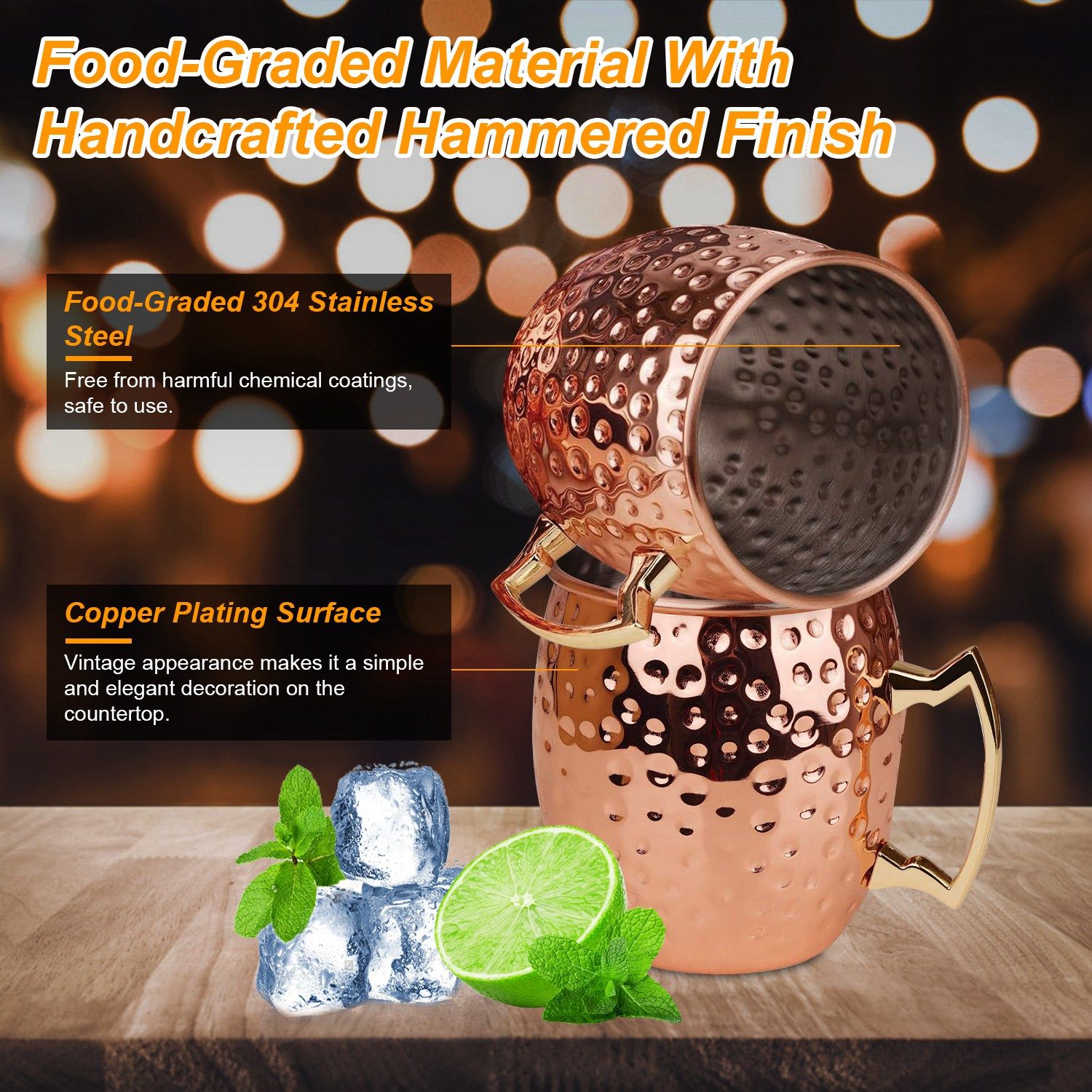 *Safe Stainless Steel*:Made of premium 304 stainless steel lining,free from harmful chemical coatings,our Moscow mule mugs set is definitely a safe and reliable choice!Additionally,the securely welded handle ensures durability while providing a comfortable grip.