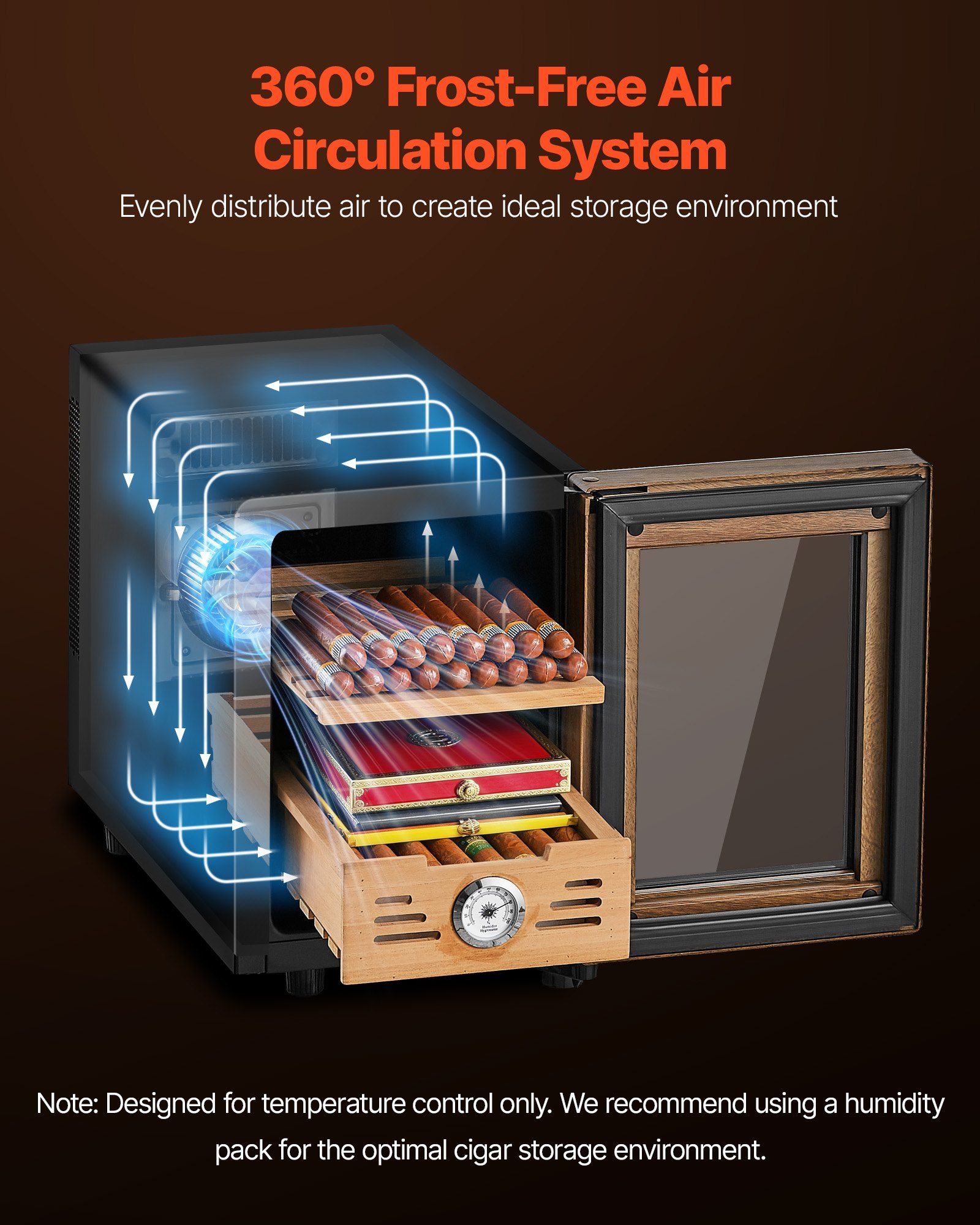 2.360° Frost-Free Air Circulation: With 360°circulating air-cooling system, you can enjoy even airflow throughout our electric cigar humidor to avoid frost and condensation buildup. Preserve the full flavor and quality of every cigar inside