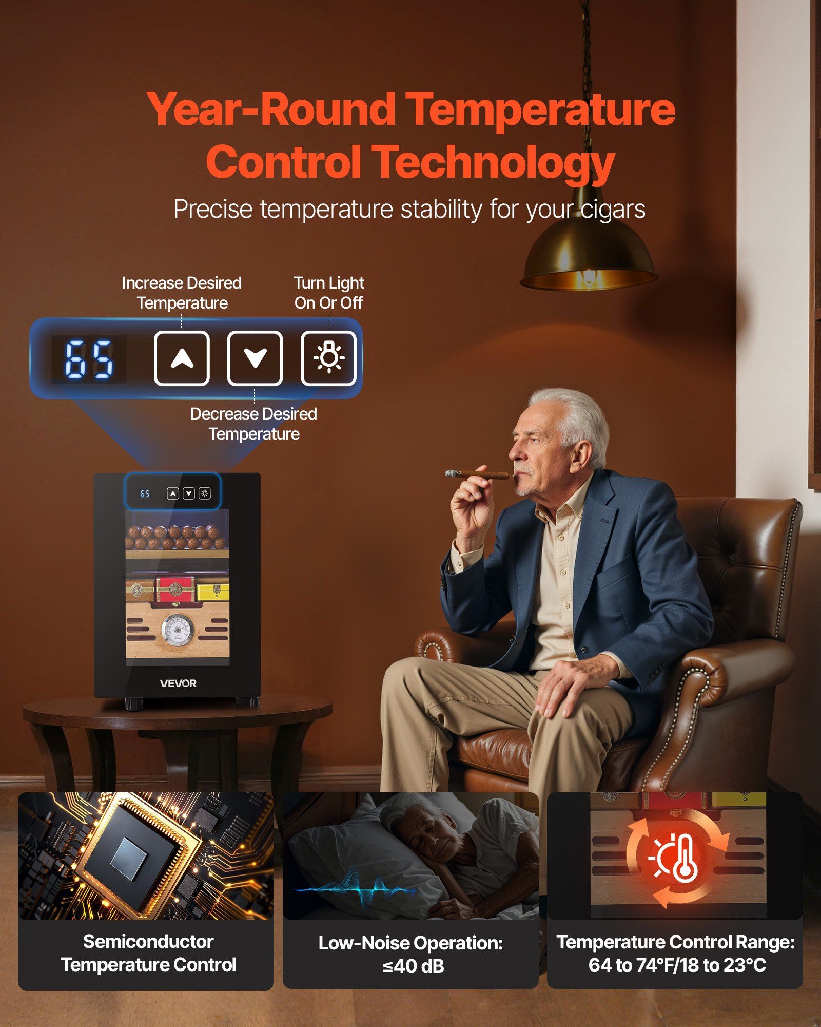 1.Constant Temperature Control: Adjust temperature, lighting, and more with a smart touch panel. The semiconductor technology keeps the electric humidor interior at a stable 64–74°F (18–23°C). Quiet operation (≤40dB) brings a peaceful cigar experience