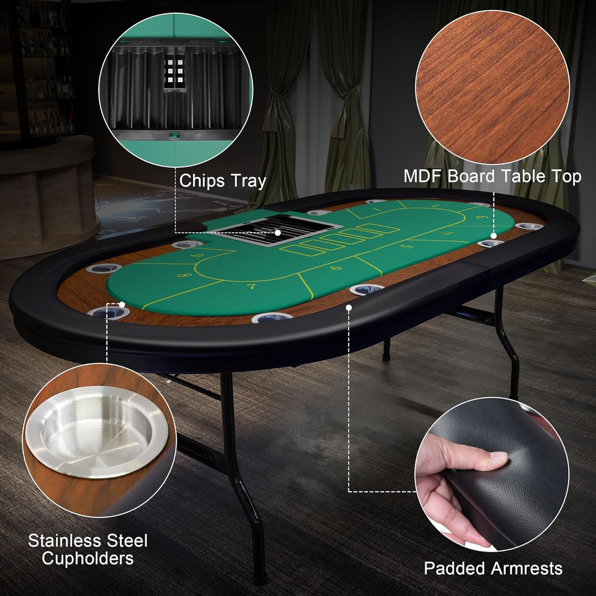 The table top is made of MDF, which helps the chips and playing cards slide more easily across the table. The edge of the tabletop is comfortably padded where players can rest their arms. The gaming table is designed with 10 cup holders, allowing each player to have their own place. Perfect for family gatherings, casino nights, neighborhood gatherings and more.