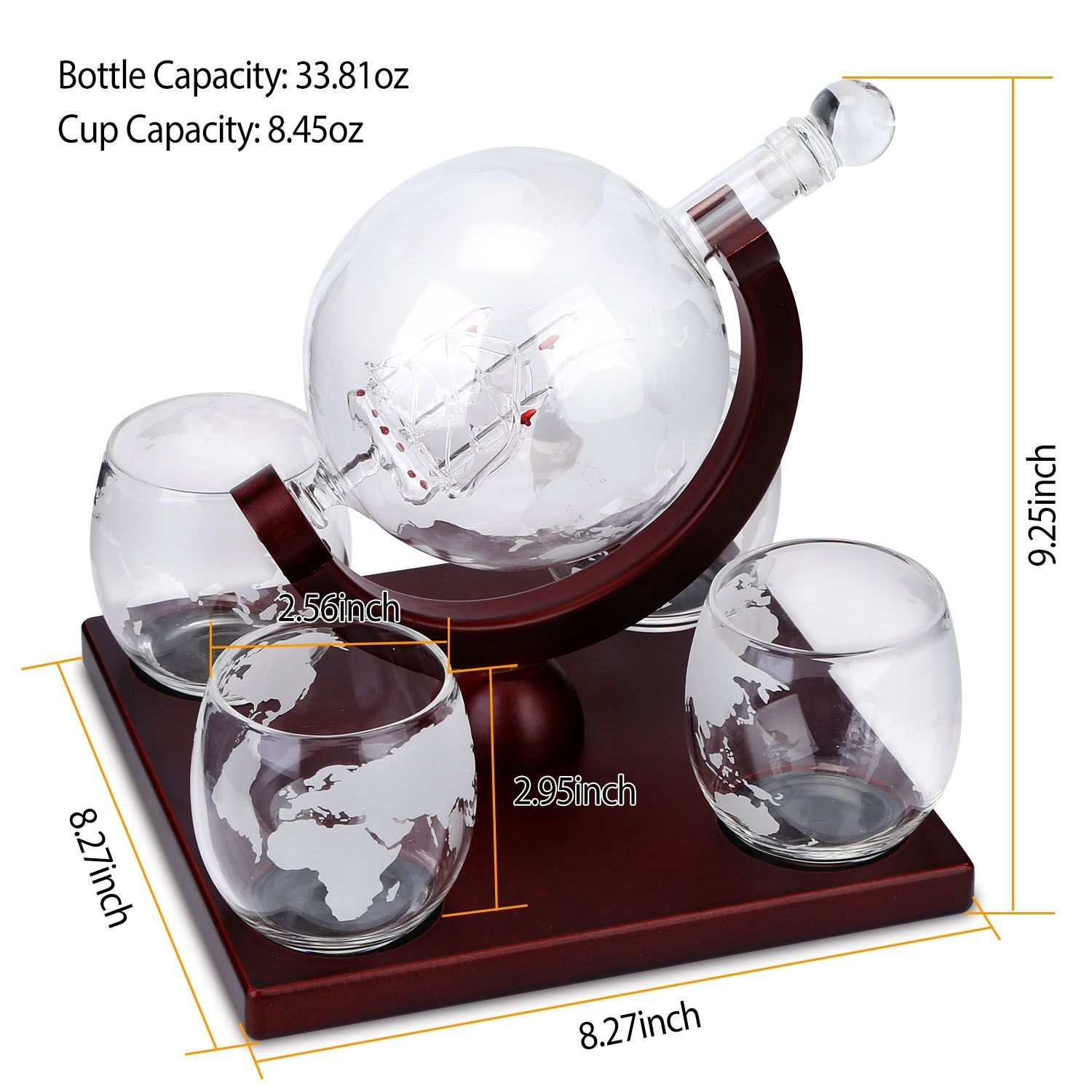 *Beautiful Decoration*:Unique complete elegant whiskey decanter set; includes an globe design decanter and unique antique ship inside; accompanied by four matching classic glasses masterly and a OSB wooden tray; which can perfectly decorate your home or enhance your bar.