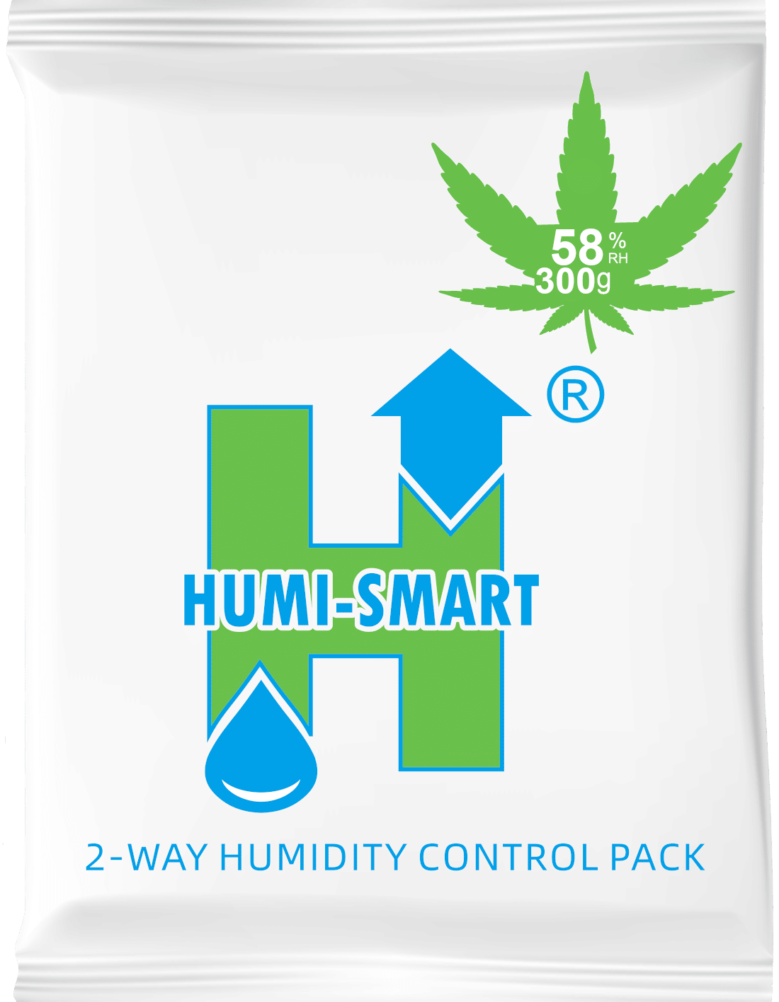 HUMI-SMART 2-way humidity control packs control moisture in an enclosed area. Our technology will either release or absorb moisture, maintaining relative humidity at 58% in a contained environment. We include a smart, simple-to-read to replacement indicator card with our HUMI-SMART packs. Simply replace the old pack with a fresh one when the dot on the replacement indicator card turns from pink to blue. The 300 Gram HUMI-SMART Two-Way Humidity Control is for up to five pounds of flower.